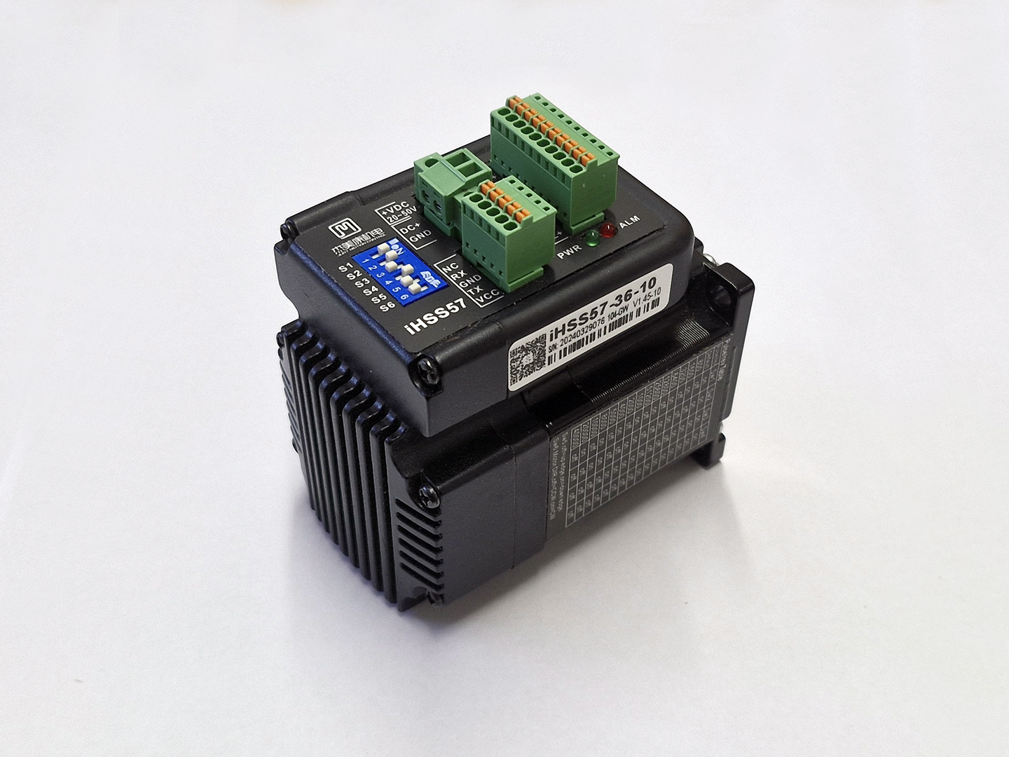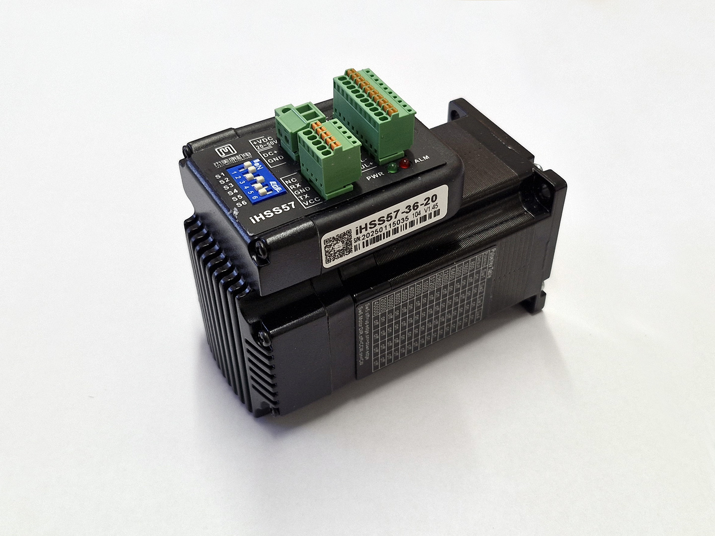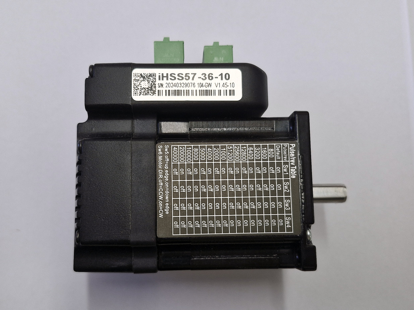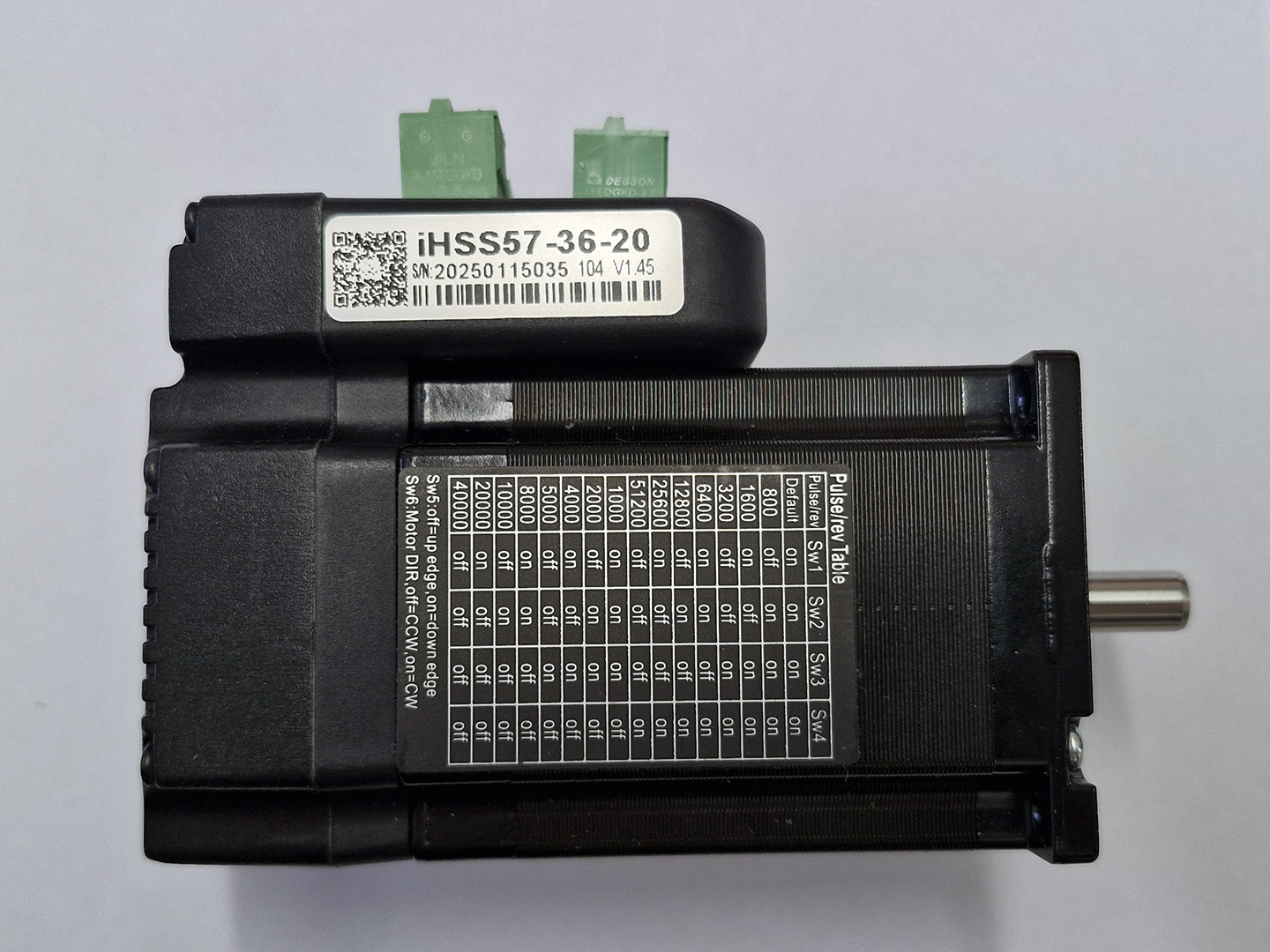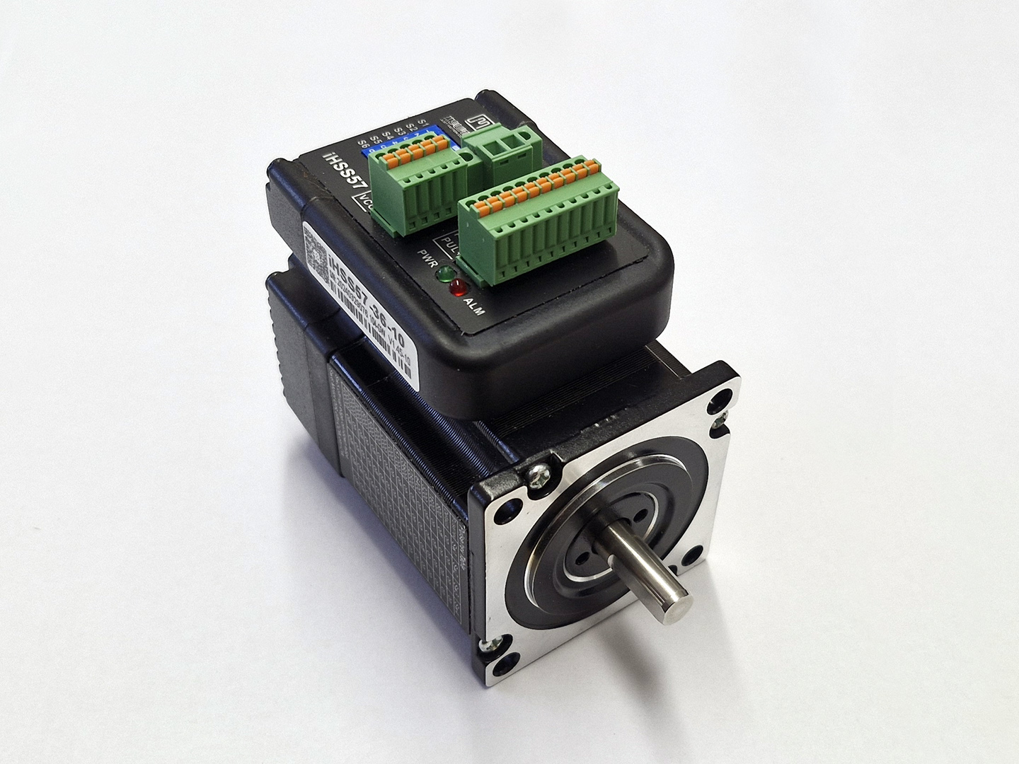 The JMC IHSS57-36 Series Stepper Motor features a space saving integrated driver removing the need for an enclosure that would hold larger external drivers. This motor uses easy to control Step & Direction signals to modify the position of the motor, the closed loop system provides Realtime feedback to accurately adjust the rotation so no steps are missed. The resolution can be adjusted using the microswitches on the front of the driver, there are 16 different combinations ranging from 400 – 40,000 pulses per revolution.
